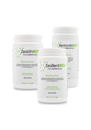 ZeolithMED, BentonitMED and ZeoBentMED are natural products with CE certification made from the indigestible natural minerals clinoptilolite zeolite and montmorillonite bentonite, which bind harmful substances in the gastrointestinal tract like a sponge and can eliminate them from the body naturally. The harmful substances bound to zeolite and bentonite are naturally excreted in the stool via the intestines without burdening the metabolism.
