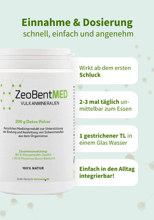 En consecuencia, ZeoBentMED puede aliviar el organismo de forma natural mediante la unión de sustancias nocivas. Además, el contenido de montmorillonita-bentonita protege la mucosa del tracto digestivo formando una película de gel protectora. ZeoBentMED ayuda a reducir síntomas como dolores de cabeza y fatiga que pueden aparecer debido a una mayor exposición a metales pesados.