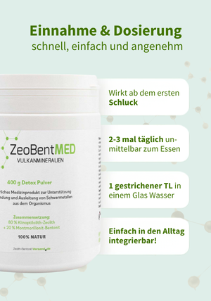 En consecuencia, ZeoBentMED puede aliviar el organismo de forma natural mediante la unión de sustancias nocivas. Además, el contenido de montmorillonita-bentonita protege la mucosa del tracto digestivo formando una película de gel protectora. ZeoBentMED ayuda a reducir síntomas como dolores de cabeza y fatiga que pueden aparecer debido a una mayor exposición a metales pesados.