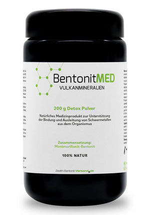 BentonitMED ist ein natürliches Produkt mit CE-Zertifizierung in Apothekenqualität aus dem Tonmineral Montmorillonit-Bentonit, das an seiner Oberfläche und den Schichtzwischenräumen verschiedene Schadstoffe binden kann und deshalb zur Detoxifikation (Entgiftung) geeignet ist. Es ist unverdaulich, wasserunlöslich sowie quellfähig und bildet bei oraler Verabreichung im Unterschied zum ZeolithMED einen dünnen Montmorillonit-Gelschutzfilm. BentonitMED eignet sich damit vor allem zur Entgiftung bei empfindsamer Schleimhaut des Verdauungskanals.